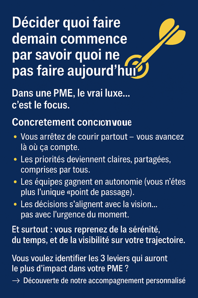 Quand une organisation retrouve sa cohérence, tout devient plus fluide : les décisions sont prises plus rapidement, l’ambiance de travail s’améliore, les équipes se sentent alignées et la performance globale augmente. La vision du dirigeant devient plus claire, ses priorités plus nettes, et la capacité à piloter l’entreprise avec sérénité se renforce.